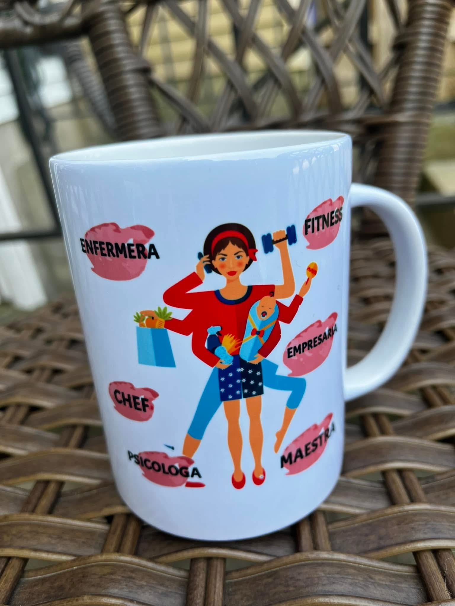 Saborea tu bebida preferida con elegancia. Esta taza de cerámica resistente está disponible en tamaños de 11 y 15 onzas, ideal como regalo para mamá. Se recomienda lavar a mano y es apta para microondas.